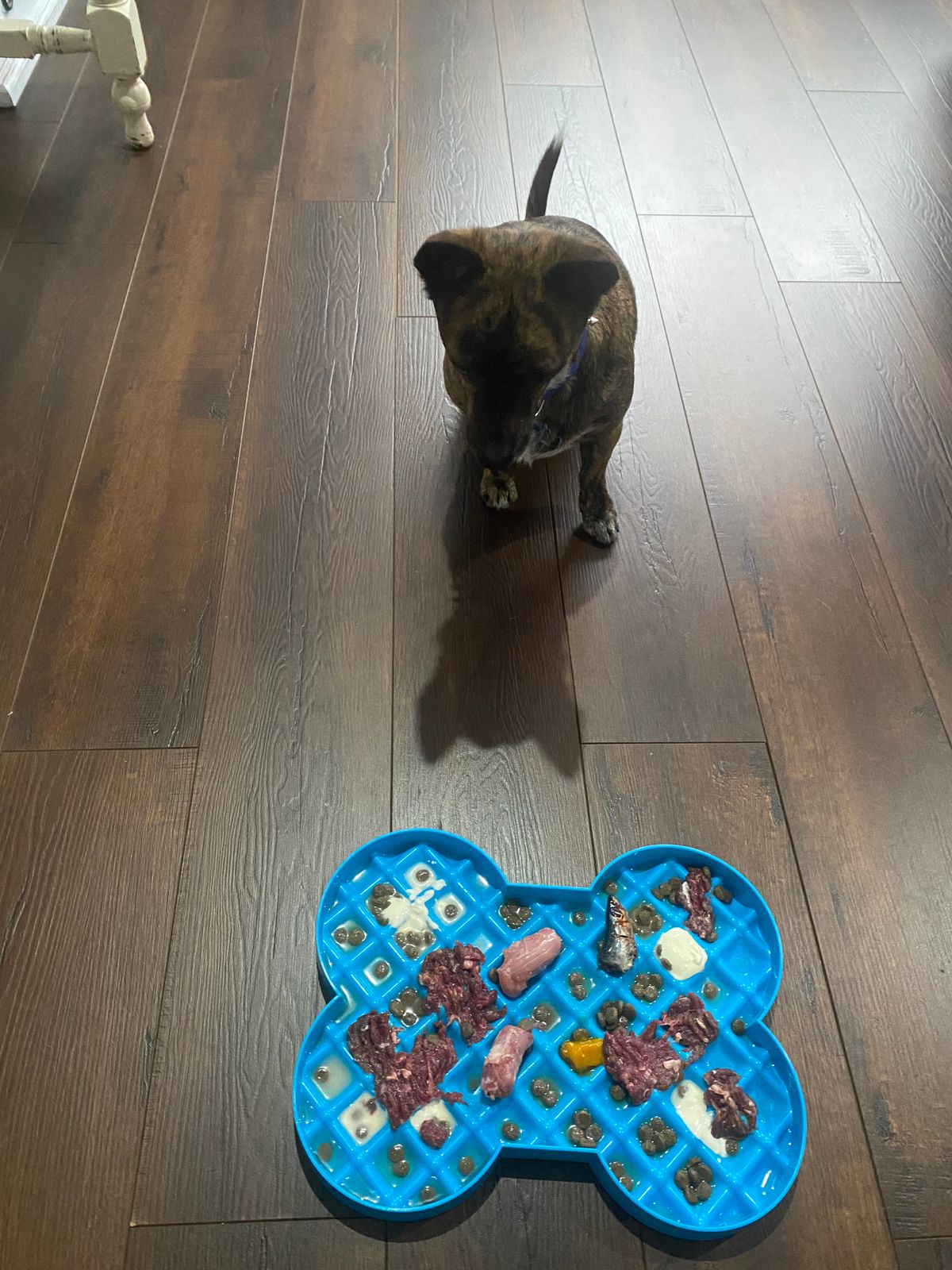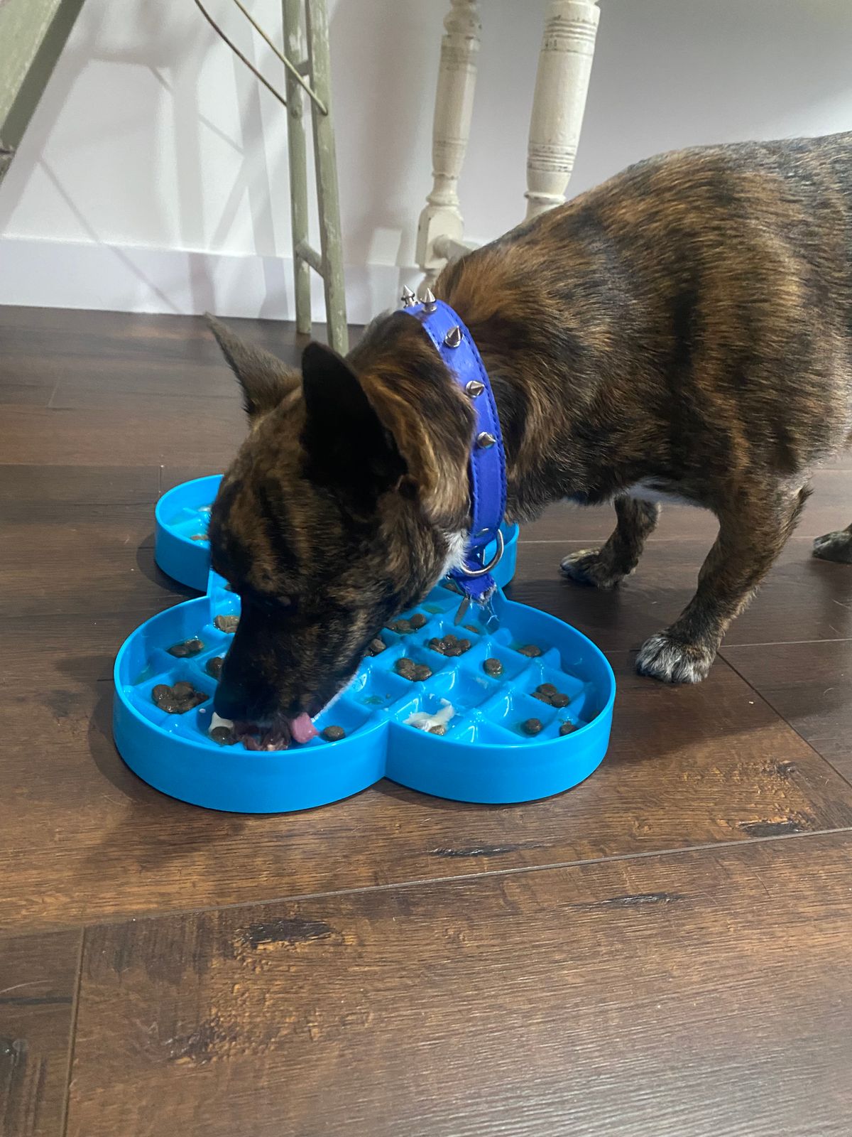 Takes my dog three times as long to eat then from a normal dish. He goes nuts for it and the colour is so pretty. Really great for him to sniff around and lick all the crevices and itβs easy to wash as well!